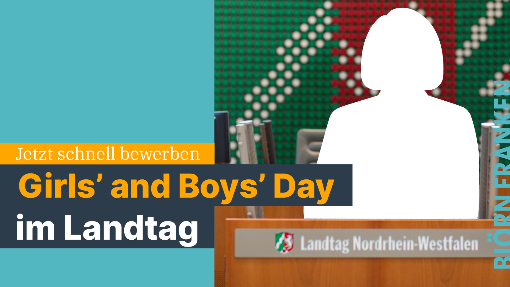 Anmeldungen sind bis zum 18. März 2026 per E Mail an bjoern.franken [at] landtag.nrw.de (subject: Bewerbung%20Girls%E2%80%99%20and%20Boys%E2%80%99%20Day%202026) möglich. Bitte senden Sie dabei Name, Vorname, Anschrift, Schule, Telefonnummer und E-Mailadresse mit.