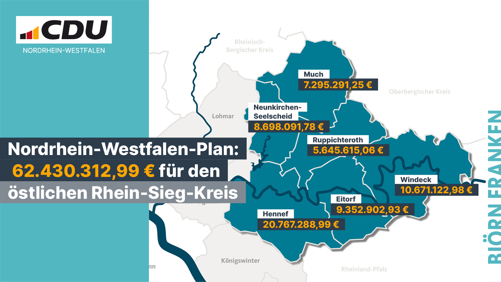 Der Nordrhein-Westfalen-Plan zeigt: Unsere Landesregierung handelt vorausschauend und zukunftsorientiert. Diese Mittel geben unseren Kommunen langfristige Planungssicherheit und machen echte Verbesserungen vor Ort möglich. Gerade in unseren ländlich geprägten Regionen ist das ein starkes Signal. Wir investieren heute in die Zukunft unserer schönen Heimat. Zusätzlich sichert das Land auch die Höhe der kommunalen Investitionspauschalen für die kommenden zwölf Jahre und entlastet die Kommunen mit einer anteiligen Übernahme der kommunalen Altschulden.